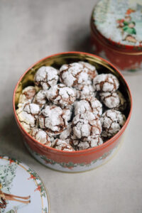 Vor dem Backen werden die rohen Teigkügelchen in viel Puderzucker gewälzt, während des Backvorgangs bricht die Kruste auf und sorgt so für diese rustikale Marmorierung. Diese ist übrigens frisch am schönsten. Auf dem Foto seht ihr links die gerade aus dem Ofen befreiten Schoko-Schnee-Kugeln, rechts ein etwas älteres Exemplar. Geschmacklich tut sich nicht viel, aber falls ihr sie verschenken wollt, würde ich das Zeitfenster klein halten.