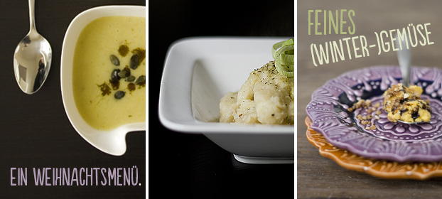 In meinem Menü spielen traditionelle Herbst- und Wintergemüse die Hauptrolle – und es ist überaus festlich, trotz (oder gerade weil?) Verzicht auf Fleisch und Fisch. Was mir bei einem mehrgängigen Menü ja auch enorm wichtig ist: Man muss alles essen können, danach aber noch in der Lage zu sein, sich zu bewegen. Das ist ja gerade bei den traditionell etwas üppigeren Wintermenüs (Sahne-Creme-Suppe mit Croutons / Braten mit Sauce, Klößen und Rotkohl / Eis oder Tiramisu mit Sahne) selten der Fall. Mein Menü ist schön leicht und stellt den Eigengeschmack saisonaler Zutaten in den Vordergrund, ohne viel Zucker oder Fett dabei zu mischen.
