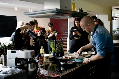 Und da ging's auch schon fix los mit dem Workshop. Ich fand's sehr interessant, mal hinter die Kulissen wahrlich professioneller Foodfotografie zu schauen. Wie viel ich mir jetzt davon mitnehmen konnte, sei dahingestellt. Aber das ist nun einmal der Unterschied zwischen Profi und Hobby: Die Hammerobjektive im mittleren vierstelligen Bereich kommen für mich eher nicht in Frage, und ich fabriziere auch keine Grillstreifen mit Metallstäben und Bunsenbrenner (auch wenn die Idee genial ist).