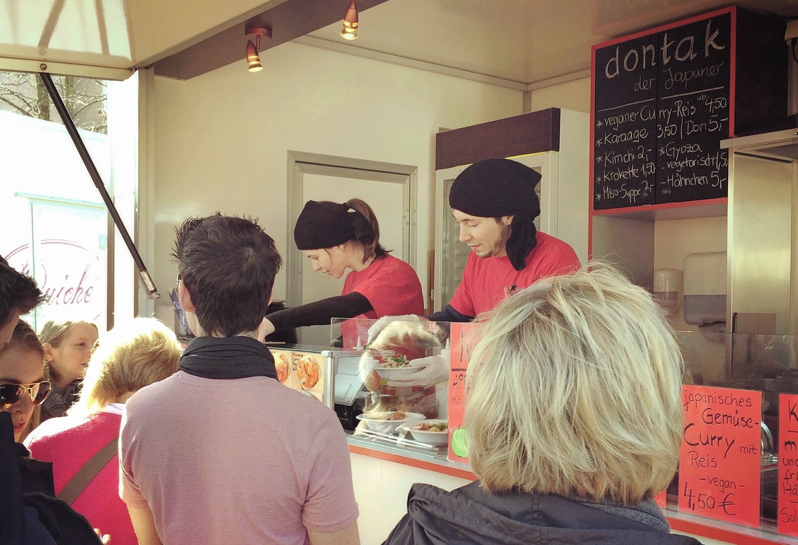 Tja, wie gesagt, der Marshmallow war schon simply too much, so dass wir erst einmal eine dringend die nächstgelegene Wasserstelle aufsuchen mussten. Nachdem wir einige Minuten frische Luft geschnappt hatten, haben wir dann nur noch bei Eva und Tak vorbei geschaut. Die beiden betreiben den Foodtruck DONTAK und hatten mich via E-Mail auf eine Stippvisite eingeladen. Leider blieb aufgrund des Ansturms nicht viel Zeit zu plaudern (schade für mich, schön für die beiden), aber für eine Miniportion Curry + Karaage fühlte ich mich dann doch noch bereit. Und das stellte sich dann tatsächlich als ideales Finish dar. Das Karaage war unbeschreiblich lecker, knusprig und frisch, das Curry perfekt „japanisch“ abgeschmeckt. Wirklich top! (★★★★★)