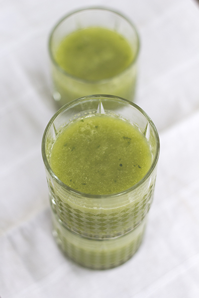 Ich habe mich für eine Gurken-Matcha-Limonade mit Basilikum entschieden. Eigentlich mache ich Getränke nicht so gerne selbst, aber dieses Jahr habe ich schon diverse Gemische produziert, die alle ziemlich prima waren: So bin ich großer Fan von Sprudel mit Holunderblütensirup und Basilikum, einfachen Infused Waters, und einem jüngst von mir kreierten Melonen-Dattel-Shake, der bei den hohen Temperaturen der letzten Wochen auch mal ein Mittagessen ersetzen kann. Mit der Gurken-Matcha-Limonade habe ich mich aber selbst übertroffen – hier stimmt einfach alles. Die Limonade ist erfrischend und schön ausgewogen süß-säuerlich. Die Gurke ergänzt sich super mit dem Basilikum, und der Matcha sorgt nicht nur für eine intensive grüne Farbe, sondern ist auch noch gesund. Ihr wundert euch vielleicht über die zwei Schichten in den Gläsern? Die Limonade schäumt ein bisschen, sobald das Mineralwasser hinzukommt. Nach ein paar Minuten hat sich der Schaum gesetzt, aber ganz ehrlich – ich finde das toll und überhaupt nicht störend. Möge die Hitzeperiode also noch lange anhalten!