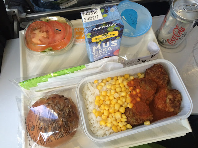 Nun, das Essen, über Umwege habe ich es geschafft, ein veganes Menü zu sichern. Auf dem Flug von Düsseldorf nach Helsinki gab es natürlich erstmal nix, nur ein Gläschen Coke. Die Fluggesellschaften müssen sparen. Ihr kennt das.