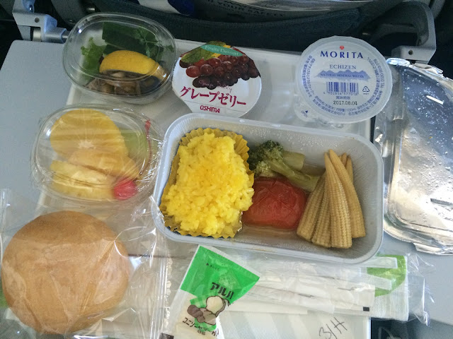 Nun, das Essen auf dem Hinflug hat mich also nicht vom Hocker gehauen. Der Knaller kam aber auf dem Rückflug. Ihr seht es schon: Gelber Reisklumpen (!?), eine Ofentomate und Mini-Maiskolben. Alles ausnahmslos ohne Geschmack, wässrig, fade. Ehrlich: Als Koch würde ich mich schämen, sowas zusammenzustellen. Dazu Obstsalat (immerhin!), fettiger Champignonsalat oder so, Brötchen (diesmal mit Gluten, die Verkrümelung meines Sitzes konnte ich also abwenden), Traubengelee (gut).Mein absolutes Highlight war allerdings: Das Eis. Es gab Eiscreme als Snack, gute, japanische Vanille-Eiscreme, ein Traum. Nur für mich gab es keine Eiscreme. Stattdessen hielt mir die freundliche Flugbegleiterin eine Banane vors Gesicht. Eine Banane.